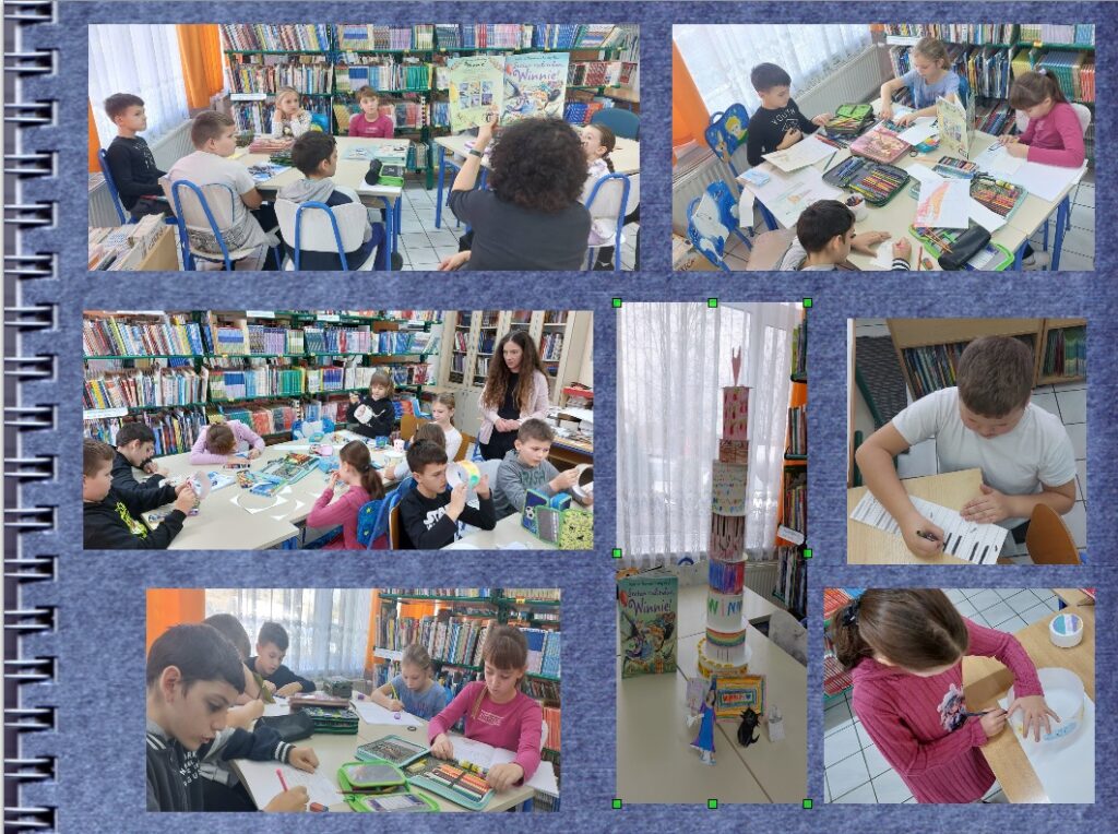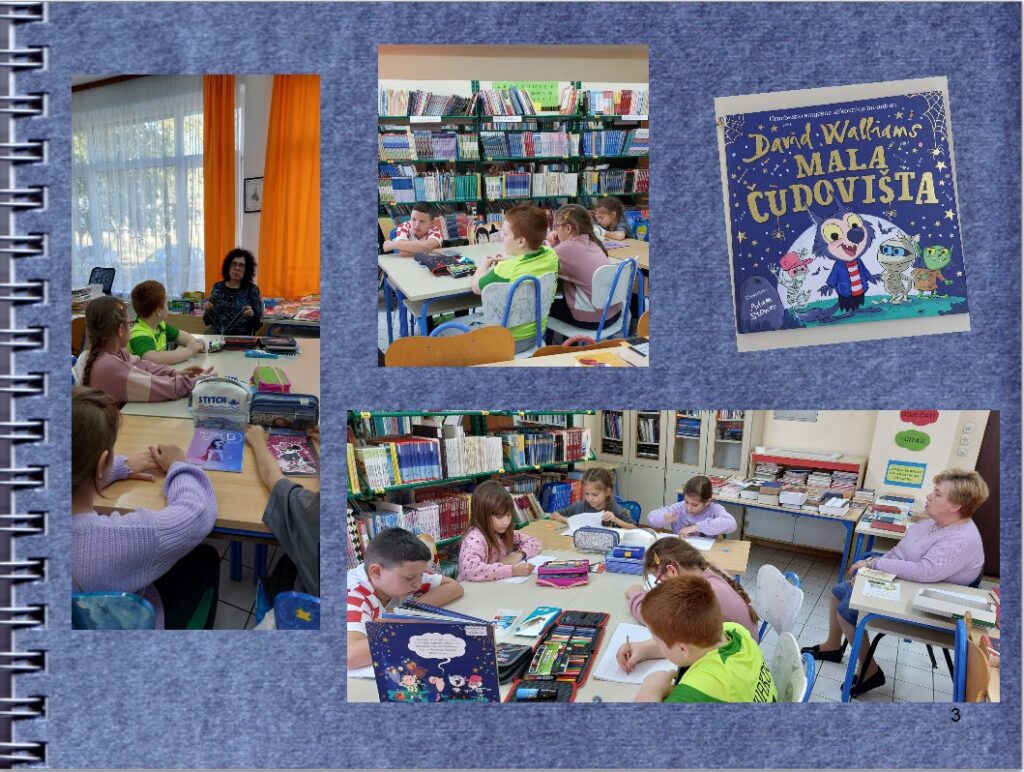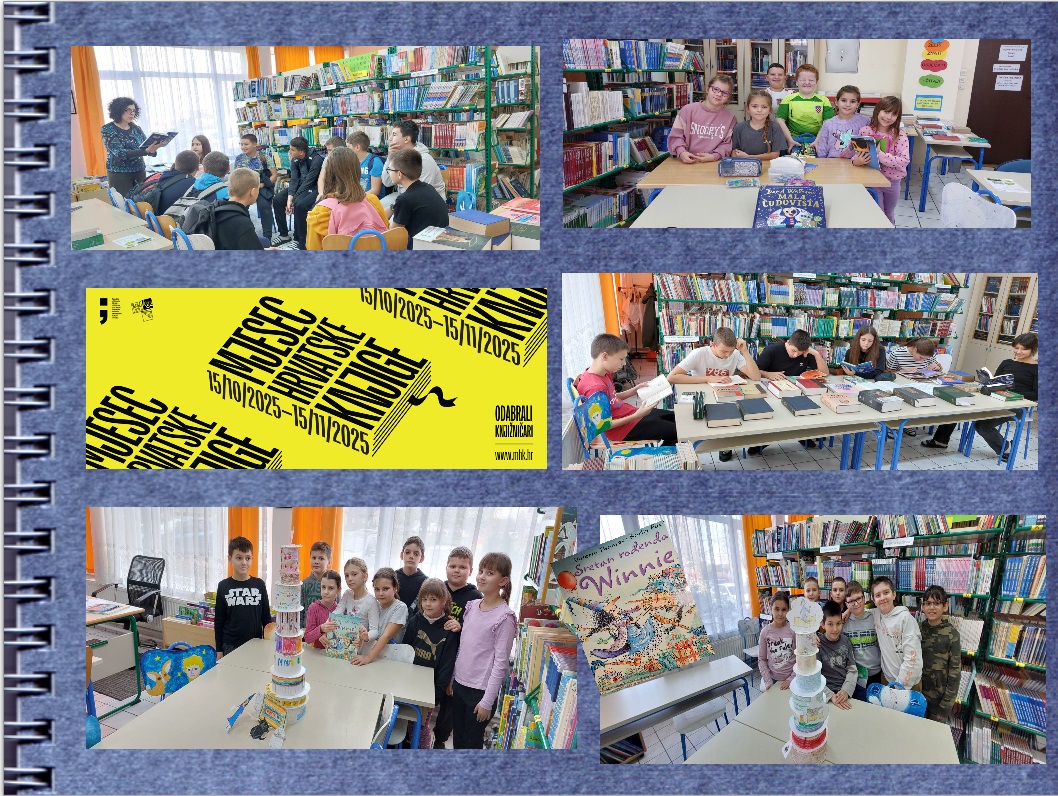 U petak 31. listopada knjižnicu su posjetili učenici 3. i 4 razreda. Poslušali su priču Sretan rođendan, Winnie! autorice Valerie Thomas. Ova razigrana priča o vještici Winnie podsjetila nas je na važnost čitanja uputa i koliko nam je uopće čitanje važno. Maštovito ilustrirana slikovnica probudila je i maštu učenika koji su izmaštali i ilustrirali slojeve rođendanske torte na papiru te nacrtali vješticu Winnie i mačka Wilbura. U ponedjeljak 10. studenoga, na našem susretu u knjižnici učenici 3. razreda dovršili su svoj rad i oblikovali tortu od papira. U četvrtak 6. studenoga učenici 2. razreda poslušali su i razgovarali o priči Mala čudovišta, autora Davida Walliamsa. Vukodlak Lunko potaknuo nas je na razgovor o međusobnim razlikama te prihvaćanja drugih uz njihove različitosti. Učenici su sa zanimanjem slušali priču, o njoj razgovarali i potom njima najzanimljiviji dio ilustrirali. Učenici 6. razreda tijekom sata razrednika upoznali su se s novim naslovima u knjižnici te zainteresirali za neke od njih nakon čitanja probranih ulomaka. U ponedjeljak 24. studenoga, iako je Mjesec hrvatske knjige već završio, u